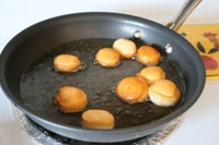 Then get your pan on medium heat with 1/4 – 1/2 cup oil. Depending on how many you make, you will need more oil. You want enough oil to cover half of the donut when cooking. Place 3-4 doughy donuts into the pan and leave until the bottom is golden brown. Don’t do anything else but watch these, as they cook fast and don’t want them to burn. Then turn them over and cook another minute or so. Using tongs, place the cooked donut on paper towels to drain and cool slightly.