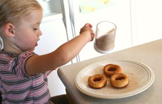 Now place the donuts on a plate and sprinkle with cinnamon and sugar. I use a shaker I bought for $1 at Walmart and it’s the best for pre-mixing cinnamon and sugar or for powder sugar too. You could also top your donuts with a powdered sugar/milk glaze. Even a chocolate frosting with sprinkles would be yummy.
