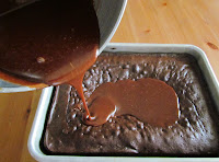 Once cake comes out of oven, pour frosting over warm cake. Do your best to spread it out evenly.